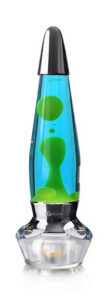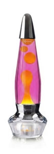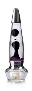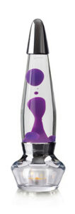 « Evo » est une lampe à lave de taille standard chauffée par bougie, fabriquée en verre transparent et en métal moulé chromé.
